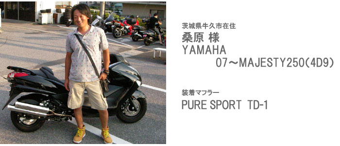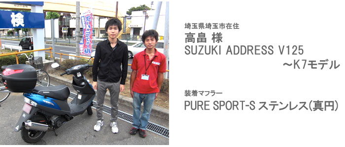 量販店・ライコランド埼玉店スタッフ 高橋 様 ■愛車 SUZUKI ADDRESS V125 〜K7モデル ■装着マフラー PURE SPORT-S トラスステー ステンレスサイレンサー(真円) |