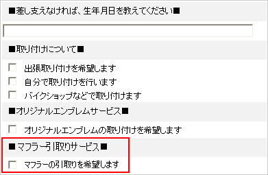 オンラインストアにてご購入の際、オプションの『マフラー引取りサービスを利用する』へチェックを入れ、ご注文下さい。